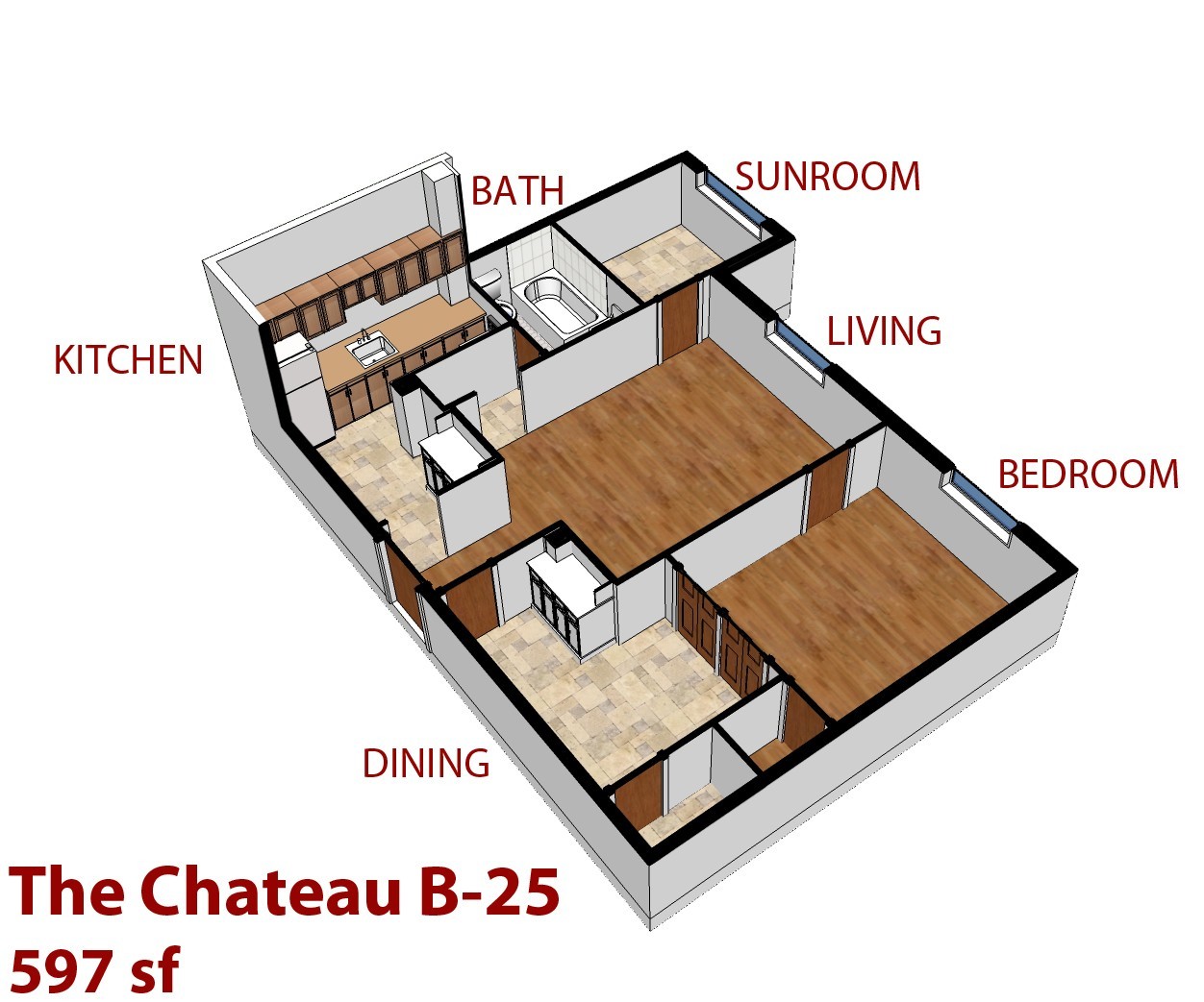 This apartment home features a unique layout complete with a full size kitchen, open living room, high ceilings, and large paned glass windows. Building amenities highlight controlled building entry, on-site laundry facility, smoke-free property, off-street parking (subject to availability), private courtyard complete with seating and BBQ, and great proximity to Downtown, Cherry Creek, and Broadway. For more information please contact our leasing office at (303) 839-1112 or via email at Leasing@AldenBrownCo.com. The Chateau Apartments is managed by Alden Brown and Co., LLC.